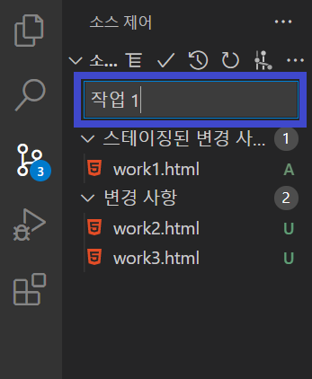 ▼ VS Code (스테이징된 변경 사항에 work1.html 이 올라온 상태)